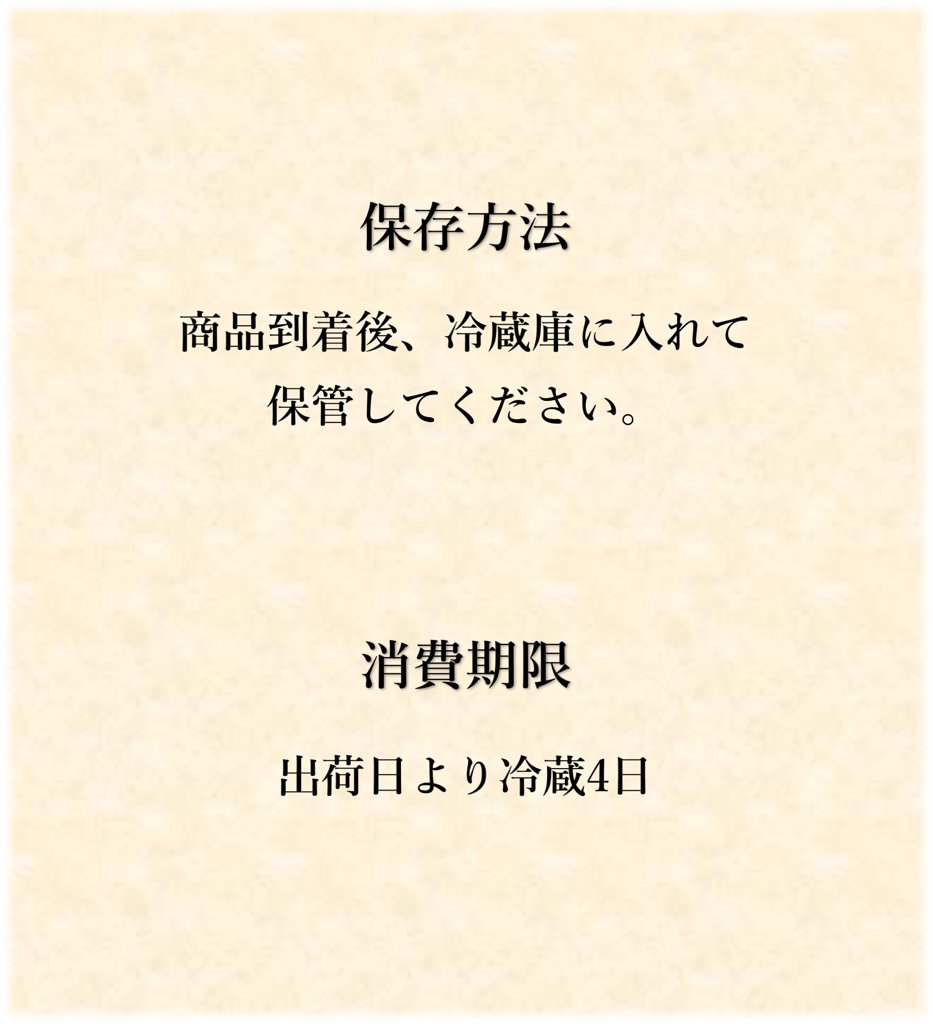 出荷日より冷蔵4日 ※賞味期限が短いため、必ずご在宅のお日にちをご指定ください※ |