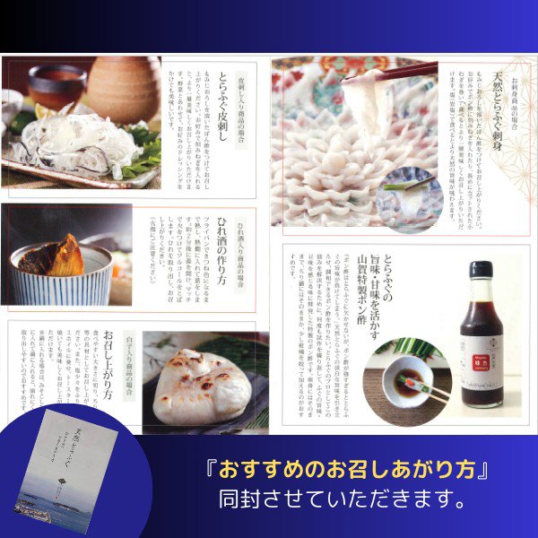 海水温が最も低い1月から3月にかけて朝に活〆した天然トラフグだけで仕込みを行い、一番美味しくお召し上がり頂ける食感にするため、3Dの冷凍技術で凍結しています。フグ刺しの付け合せに最高な地元下関で栽培された安岡ねぎも付いています。
