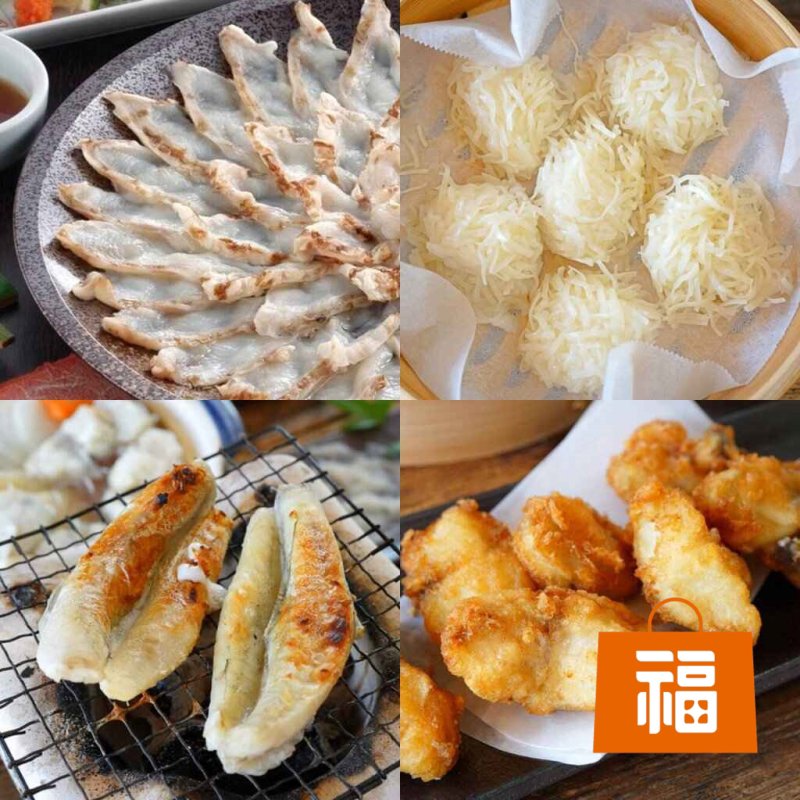 フグタタキ刺身30g ふぐ一汐180g ふぐ唐揚げ180g ふく入り焼売6個 ふく白子入りつみれ6粒 ポン酢14g もみじおろし2.5g |